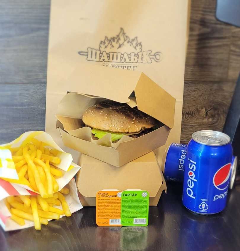Найсмачніший гриль-бургер із соковитою котлетою з яловичини, картопля фрі, Пепсі 0,3 л та соус на вибір!